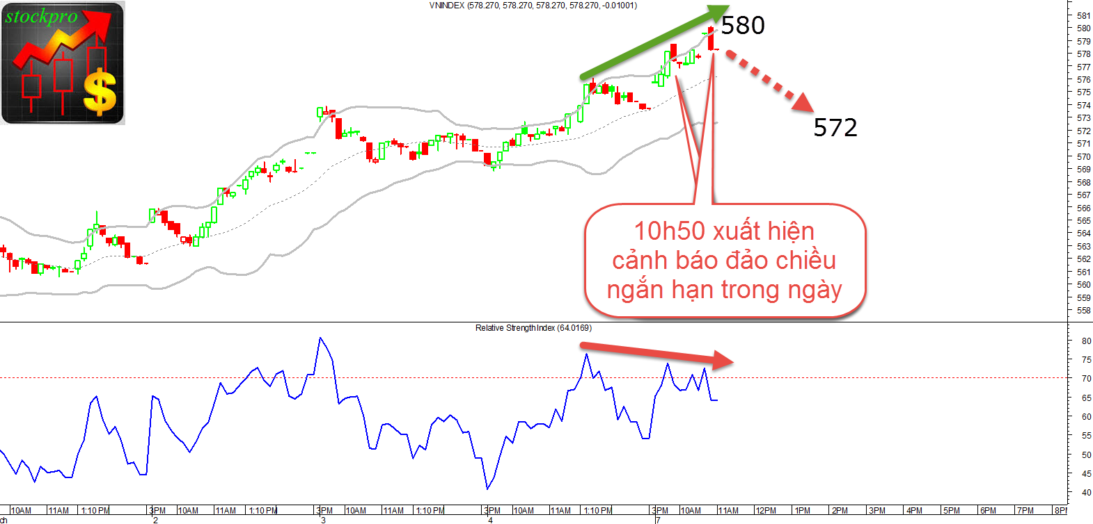 Vào lúc 10h50 sáng nay chỉ số VNIndex nó đã tạo ra một cảnh báo đảo chiều giảm giá trong ngày khi mà hiện tượng phân kỳ giữa đường giá và chỉ báo RSI liên tục được xuất hiện trên đồ thị (hình dưới):
